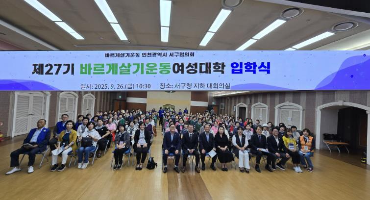 [무한뉴스=정승훈 기자] 바르게살기운동 인천 서구협의회는 9월 27일 서구청 대회의실에서 ‘제27기 바르게살기운동 서구여성대학 입학식’을 개최했다.