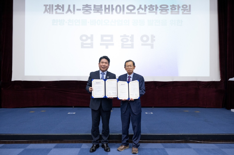 [무한뉴스=정민정 기자] 제천시는 9월 30일 ‘2025 제천국제한방천연물산업엑스포’ 기간 중 한방생명과학관 다목적강당에서 충북바이오산학융합원과 한방·천연물산업 발전을 위한 업무협약(MOU)을 체결했다.