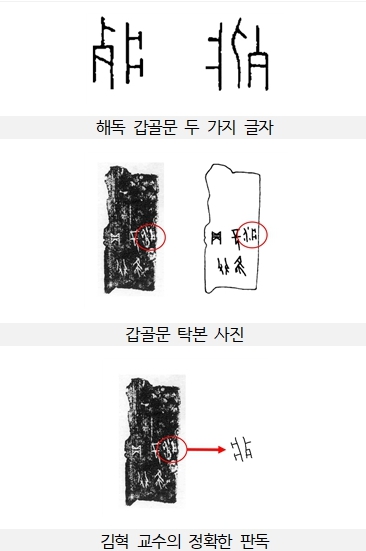 그 근거 가운데 가장 중요한 신의 한수는 아래 탁본에 나와 있는 글자를 기존의 모든 갑골문 연구자들이 잘못 해석한 것을 김혁 교수가 찾아내 바로잡은 것이다(사진 4. 갑골문 탁본 사진).