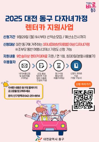 [무한뉴스=정민정 기자] 대전 동구는 다자녀 가정의 여가활동 지원과 아이 키우기 좋은 환경 조성을 위해 ‘2025년 다자녀 가정 렌터카 지원사업’을 본격 추진, 이달 29일부터 참여자를 모집한다고 밝혔다.