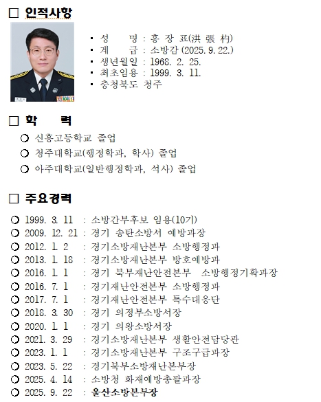 | ▲ 홍장표 신임 울산소방본부장 프로필 |