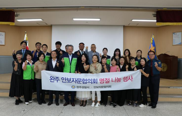[무한뉴스=정민정 기자] 완주경찰서는 추석명절을 맞이해 지난 29일, 추석명절을 맞이하여 군의회 김재천 부의장, 이순덕 의원 및 안보자문협의회, ㈜정석케미칼, 삼례·봉동 로타리클럽, 봉동로타리클럽등 30여명은 탈북민을 위한 따뜻한 사랑 나눔 행사를 가졌다.