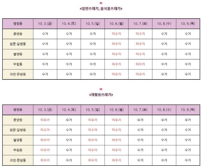 생활폐기물 수거는 일반 쓰레기의 경우 3일, 4일, 5일, 8일, 9일에, 재활용 쓰레기는 4일, 7일, 8일, 9일에 각각 수거된다.