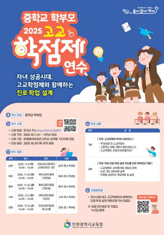 이번 연수는 11월 6일부터 12월 2일까지 인천 관내 중학교 학부모를 대상으로 진행되며, 고교학점제와 교육과정에 대한 이해를 높이고 학부모의 진로·학업 지원 역량을 강화하기 위해 마련됐다.