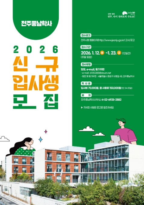 [무한뉴스=정민정 기자] 인재 양성의 요람인 전주시 서울장학숙 전주풍남학사가 2026년도 신규입사생을 모집한다.