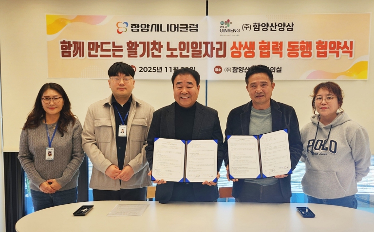 [무한뉴스=최진수 기자] 함양시니어클럽(관장 김용환)은 21일 글로벌 수출 선도기업인 농업회사법인 ㈜함양산양삼(대표 이종상)과 노인일자리사업 및 지역사회 상생발전을 위한 업무협약(MOU)을 체결했다고 밝혔다.