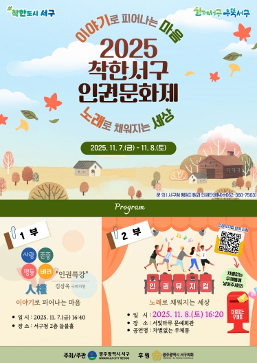 [무한뉴스=정민정 기자] 광주광역시 서구가 주민 참여 기반 인권문화 정착에 박차를 가한다. 서구는 오는 7일과 8일 이틀간 ‘이야기로 피어나는 마음, 노래로 채워지는 세상’을 주제로 ‘2025 착한서구 인권문화제’를 개최한다.