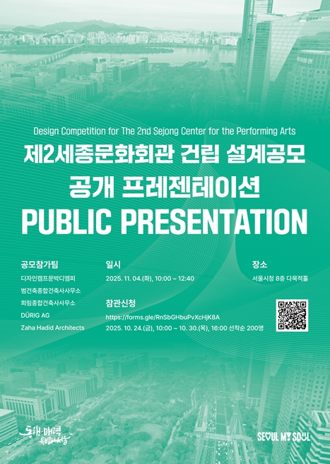 공개 프레젠테이션 참관을 희망하는 경우, 10월 24일부터 30일까지 서울시 설계공모 홈페이지 ‘프로젝트 서울’을 통해 신청할 수 있다. 현장에 참석하지 못하는 시민들도 유튜브 중계를 통해 실시간으로 시청할 수 있다.