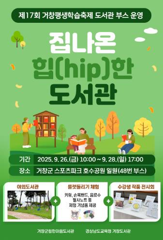 [무한뉴스=최진수 기자] 거창군립한마음도서관과 경상남도교육청 거창도서관은 오는 26일부터 28일까지 3일간 거창군 스포츠파크 일원에서 개최되는 제17회 거창평생학습축제 동안 『집나온 힙(hip)한 도서관』 부스를 운영한다고 밝혔다.