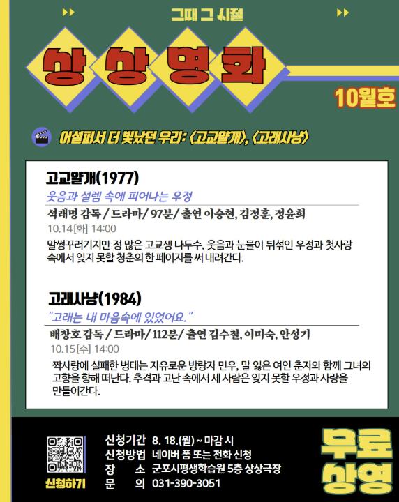 [무한뉴스=손성기 기자] 군포문화재단 군포시평생학습원은 시민들의 문화 향유와 세대 공감을 위해 오는 10월 14일과 15일 상상극장에서 고전 영화 상영 프로그램 〈상상명화〉를 운영한다. 이번 상영작은 ‘고교얄개’와 ‘고래사냥’으로 무료 상영된다.