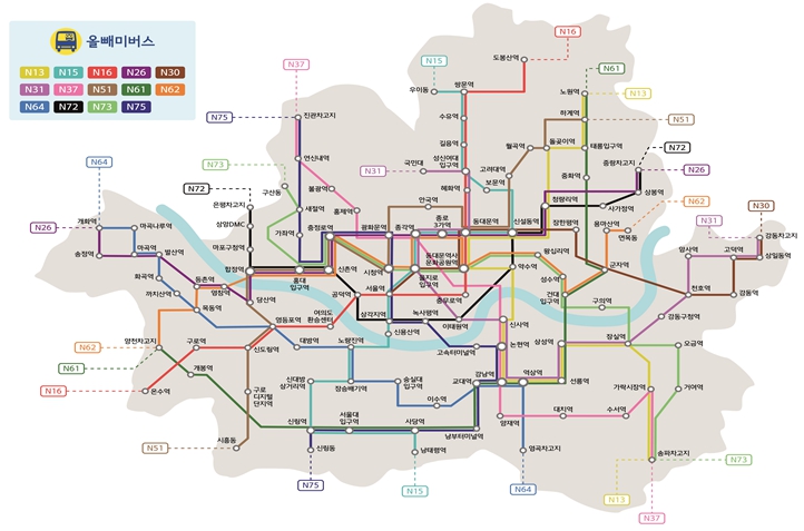 | ▲ 심야N버스 운행계통(14개 노선, 총 140대) |
