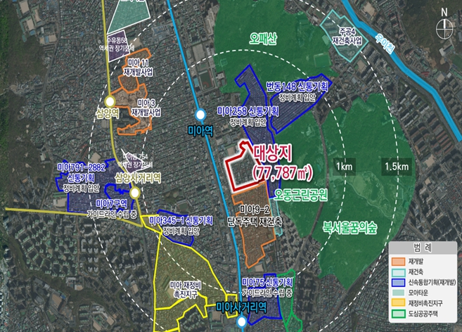 이번 신속통합기획은 과거 주택단지 중심 개발로 시가지와 단절됐던 오패산 녹지축을 미아역(도봉로) 일대까지 확장하고, 입체공원 도입과 사업성 보정계수(1.8) 적용을 통해 총 1,730세대, 최고 35층 규모의 쾌적하고 안전한 주거단지를 조성하는 것이 핵심이다.