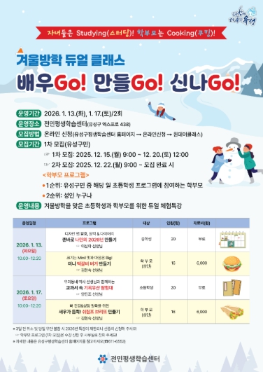 [무한뉴스=정민정 기자] 대전 유성구는 전민평생학습센터에서 1월 13일과 17일 양일간 초·중학생과 학부모를 위한 체험형 프로그램 ‘듀얼 클래스, 배우GO! 만들GO! 신나GO!’를 운영한다.