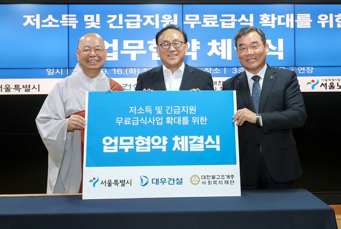 | ▲ 서울시와 ㈜대우건설, 대한불교조계종사회복지재단이 저소득 어르신 급식지원 확대를 위한 업무협약을 맺었다. (좌측부터 도륜스님 대한불교조계종사회복지재단 대표이사, 윤종장 서울시 복지실장, 김보현 ㈜대우건설 대표이사) |