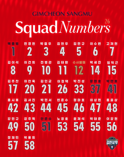 [무한뉴스=최진수 기자] 김천상무가 2026시즌 프로선수단 배번을 공개했다.