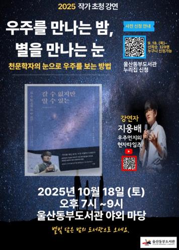 [무한뉴스=최진수 기자] 울산 동부도서관은 오는 10월 18일 오후 7시 야외 잔디마당에서 천문학자이자 유튜브 1인 방송 진행자(크리에이터) 지웅배 작가의 초청 강연 ‘우주를 만나는 밤, 별을 만나는 눈’을 연다.