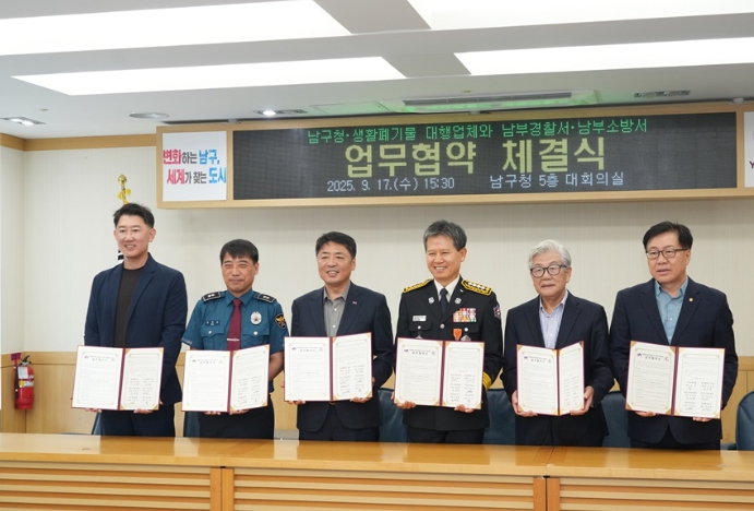 [무한뉴스=최진수 기자] 부산 남구는 지난 17일 구청 대회의실에서 남부경찰서, 남부소방서, 생활폐기물 대행업체와 업무협약(MOU)을 체결하고, 주민의 생활 현장에서 위험 요소를 조기 발견·대응하는 생활 속 안전망 구축 사업을 본격 추진한다고 밝혔다.