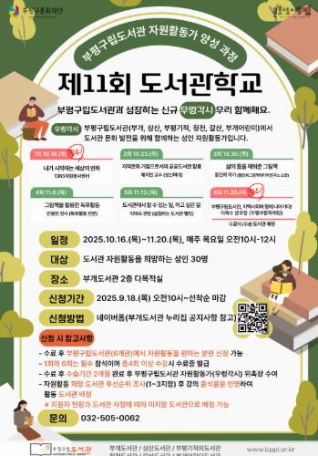 [무한뉴스=정승훈 기자] 부평구 구립 부개도서관은 18일부터 2025년 부평구립도서관 자원활동가 양성 과정 ‘제11회 도서관학교’ 참가자를 모집한다.