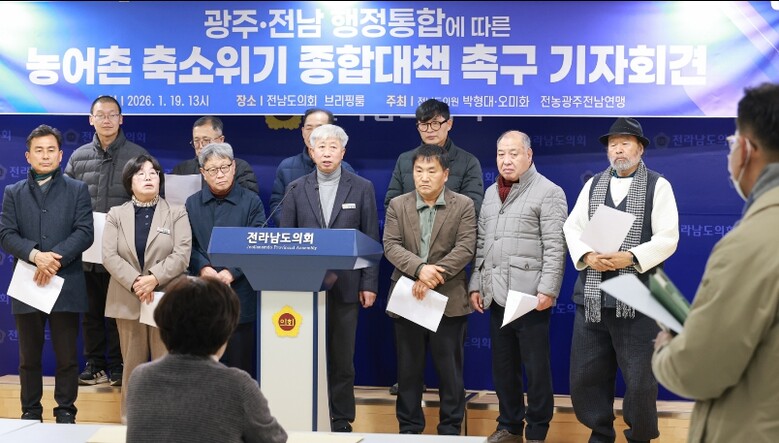 [무한뉴스=정민정 기자] 전라남도의회 박형대 의원(진보당·장흥1)은 1월 19일 도의회 브리핑룸에서 기자회견을 열고 “광주ㆍ전남 행정통합 논의가 속도를 내고 있지만 농어촌 축소 위기에 대한 대비는 현저히 부족하다”며 농어촌 보호를 위한 구체적 합의를 요구했다.