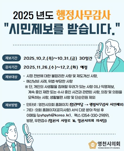 [무한뉴스=최진수 기자] 영천시의회는 2025년도 행정사무감사를 앞두고 10월 31일까지 시민제보를 받는다.