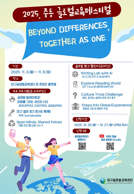 [무한뉴스=최진수 기자] 대구교육연수원 산하 대구글로벌교육센터는 11월 3일부터 8일까지 ‘Beyond Differences, Together as One(차이를 넘어, 하나로)’을 주제로 '2025 중등 글로벌교육페스티벌'을 개최한다.