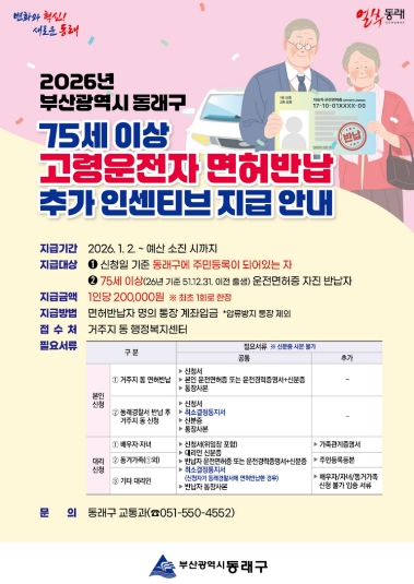 | ▲ 부산 동래구, 고령 운전자 운전면허 자진 반납 추가 인센티브 20만 원 지급 |