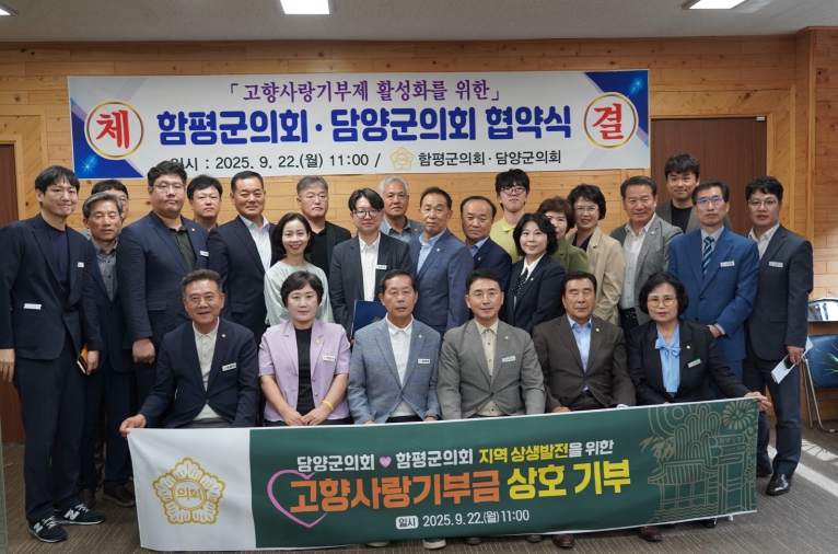 [무한뉴스=정민정 기자] 담양군의회는 22일 함평군의회에서 고향사랑기부금 상호 기탁식을 갖고, 기부 문화 확산과 동시에 지역사랑 실천에 앞장서는 뜻깊은 행보를 이어갔다.