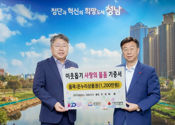 ㈜대원버스도 34개 노선에 421대의 시내·광역버스를 운행하며 800여 명의 운수종사자들이 근무하고 있다. 2019년부터 지금까지 쌀, 상품권 등 약 1억7000만원 상당의 물품을 성남시에 기탁하며 지역사회 나눔에 동참해왔다.