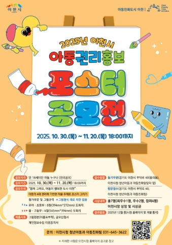 [무한뉴스=정충근 기자] 이천시는 10월 30일부터 11월 20일까지 아동권리에 대한 인식 확산을 위해 ‘2025년 이천시 아동권리 홍보 포스터 그리기 공모전’을 실시한다고 밝혔다.