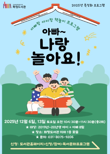 [무한뉴스=정승훈 기자] 고양특례시 화정도서관은 오는 12월 6일, 13일 오전 10시 30분, 화정도서관 지하 1층 꽃뜰에서 특성화 프로그램 ‘아빠~ 나랑 놀아요!'를 운영한다.