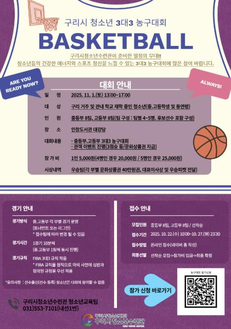 [무한뉴스=정승훈 기자] 구리시청소년재단 청소년수련관은 '2025 구리시 청소년 3대3 농구대회' 참가 신청을 10월 22일부터 10월 27일까지 온라인으로 신청받는다고 밝혔다.
