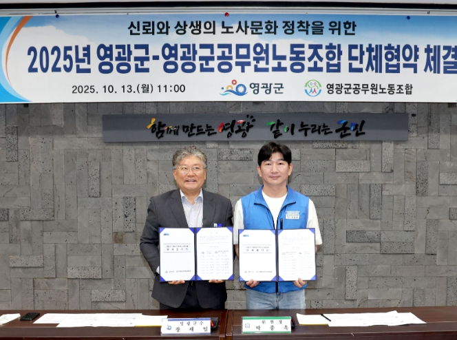 [무한뉴스=정민정 기자] 영광군은 지난 10월 13일 군청 2층 소회의실에서 영광군공무원노동조합과 “2025년 단체협약식”을 체결했다.