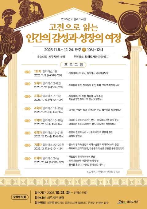 [무한뉴스=정민정 기자] 제주시 탐라도서관은 고대 그리스 서사시 ‘일리아스’를 활용한 ‘고전으로 읽는 인간의 감성과 성장의 여정’ 프로그램 참여자를 모집한다.