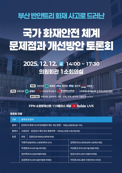 좌장을 맡은 강윤진 한국화재소방학회 회장은 “오늘의 토론회는 반얀트리 화재로 민낯을 드러낸 화재안전 정책과 제도의 근본적인 문제점을 들여다보는 자리”라며 “정부의 정책과 제도가 올바른 방향으로 개선되어 국민의 생명과 재산을 견고하게 지켜나갈 수 있기 바란다”고 당부했다.