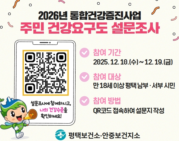[무한뉴스=정승훈 기자] 평택시 평택보건소는 10일부터 오는 19일까지 지역사회 주민 500명을 대상으로 2026년 통합건강증진사업 계획 수립을 위한 ‘주민 건강요구도 조사’를 시행 중이라고 밝혔다.