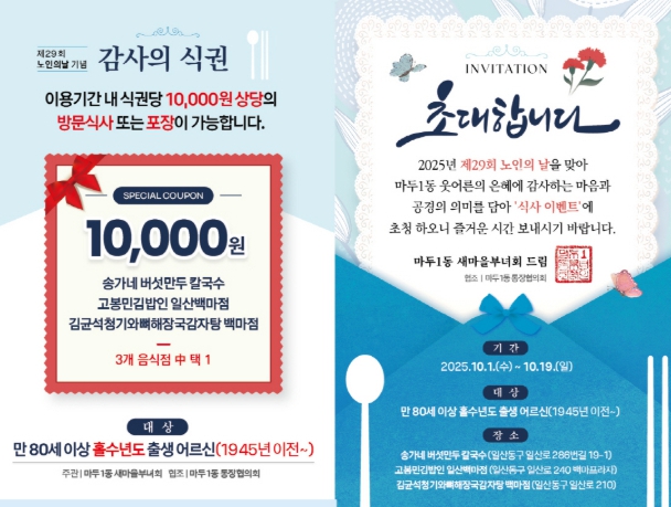 행사는 어르신들이 선호하는 지역 식당 3곳을 선정하고, 기간 내 자유롭게 식사를 할 수 있는 식사권을 나눠주는 방식으로 진행됐다.