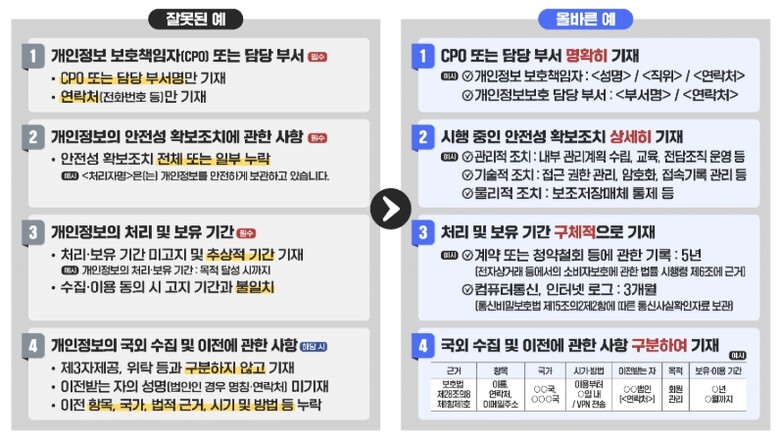 처리자들이 주로 미흡하게 기재하는 항목은 개인정보 보호책임자의 성명 또는 개인정보 보호업무 및 관련 고충사항을 처리하는 부서의 명칭과 전화번호 등 연락처, 개인정보의 안전성 확보 조치에 관한 사항, 개인정보의 처리 및 보유 기간 등으로 파악됐으며, 추상적으로 기재하거나 누락하지 않도록 주의가 필요하다.