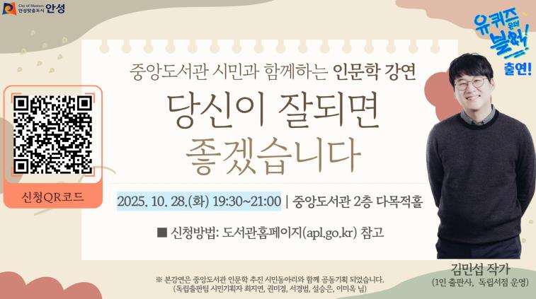 [무한뉴스=정충근 기자] 안성시는 오는 10월 28일 저녁 7시 30분, 중앙도서관 다목적홀에서 정미소출판사 대표이자 『당신이 잘되면 좋겠습니다』의 저자 김민섭 작가를 초청해 시민 강연회를 개최한다.