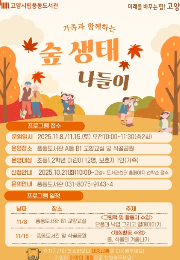 [무한뉴스=정승훈 기자] 고양특례시 풍동도서관은 공공도서관 독서문화 프로그램 ‘가족과 함께하는 숲 생태 나들이’를 운영한다.