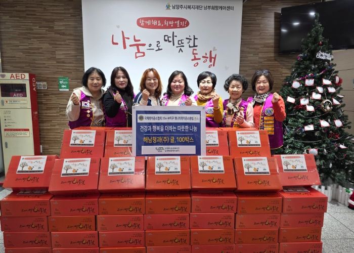 [무한뉴스=정승훈 기자] 남양주시는 12월 2일 국제라이온스협회 354-H지구 개나리라이온스클럽이 지역 내 복지취약가정을 위해 5kg 귤 100박스(160만 원 상당)를 남양주시 남부희망케어센터에 후원했다고 밝혔다.