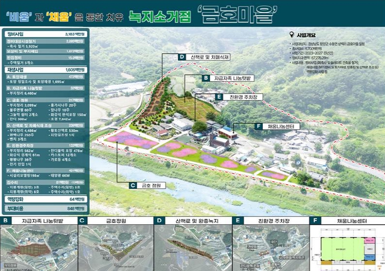 금호지구 농촌공간 정비사업은 2023년부터 2027년까지 수동면 금호마을 일원에 총사업비 57억 원(국비 28.5억 원, 지방비 28.5억 원)을 투입해, 낙후된 농촌 환경을 개선하고 주민들의 정주 여건을 효율적으로 향상하기 위한 다양한 공간 재정비가 이루어진다.