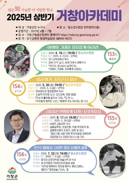 2025년 상반기 거창아카데미는 △4월 16일 최순자 여행작가의 ‘여행이 그대를 자유롭게 하리라’ △5월 20일 공지영 소설가의 ‘지금 여기 그리고 나 자신’ △6월 17일 진태경 투자전문가의 ‘금융자산 현명하게 지키는 다섯 가지 팁’ △7월 22일 김성태 캘리그래피 강사의 ‘붓으로 피어나는 다양한 캘리그래피의 세계’로 구성되어 있다.