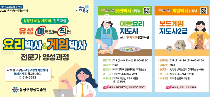 [무한뉴스=정민정 기자] 대전 유성구는 오는 7월부터 취업을 희망하는 사회 초년생과 경력 보유 청장년 여성을 대상으로 ‘유성매직, 요리박사&게임박사’ 전문가 양성 과정을 운영한다.