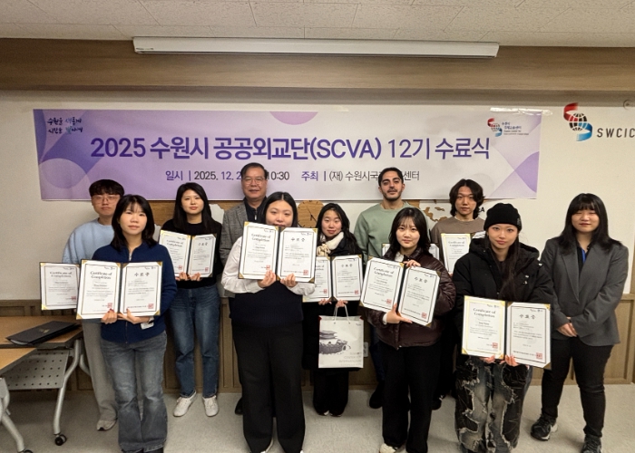 [무한뉴스=양현명 기자] 수원시국제교류센터가 22일 센터에서 ‘수원시 공공외교단(SCVA) 12기’ 수료식을 열고, 단원 16명에게 수료증을 전달했다. 우수활동자 4명에게는 상장을 수여했다.