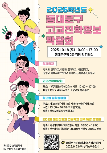 [무한뉴스=정승훈 기자] 서울 동대문구는 오는 10월 18일 토요일 오전 10시부터 오후 5시까지 구청 내 다목적 강당, 제2회의실, 사내아카데미에서'2026학년도 고교 진학정보 박람회'를 개최한다고 밝혔다.