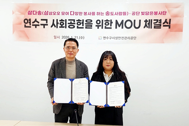 [무한뉴스=정승훈 기자] 연수구시설안전관리공단은 21일 지역주민 중심의 봉사단체인 ‘삼다송 봉사단’과 지역사회 사회공헌 활성화를 위한 업무협약(MOU)을 체결했다고 밝혔다.