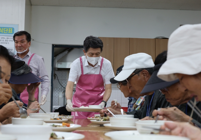 [무한뉴스=최진수 기자] 이강덕 포항시장이 2일 추석을 앞두고 무료급식소 ‘만나의집’을 방문해 어르신 200여 명에게 배식 봉사를 하며 감사의 마음을 전했다.