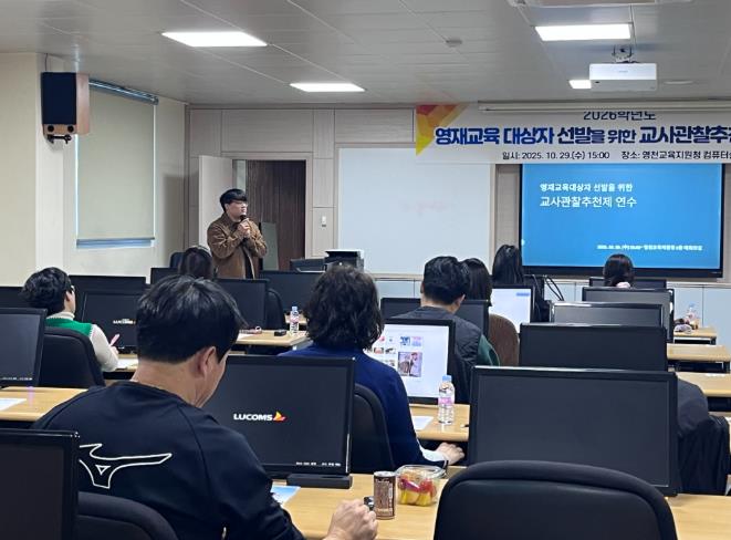 [무한뉴스=최진수 기자] 경상북도영천교육지원청은 10월 29일 오후 3시, 영천교육지원청 3층 컴퓨터실에서‘2026학년도 영재교육대상자 선발을 위한 교사관찰추천제 연수’를 실시했다.
