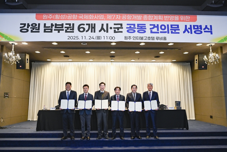 [무한뉴스=정민정 기자] 강원 남부권 6개 시군(원주·횡성·영월·평창·정선·태백)은 24일 오전 11시, 호텔인터불고 원주에서 국토교통부의 ‘제7차 공항개발 종합계획’에 ‘원주(횡성)공항의 국제화 사업 반영’을 요청하는 공동 건의문을 채택했다.