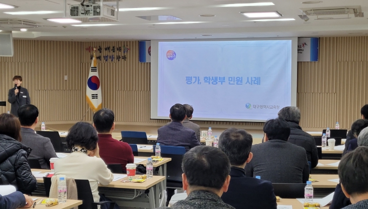 [무한뉴스=정승훈 기자] 대구시교육청은 12월 22일 오후 2시부터 동관 7층 대회의실에서 사립 학교의 학사 운영 전반에 대한 이해를 돕고, 안정적이고 책임 있는 학교 운영을 지원하기 위해 사립 고등학교장 49명을 대상으로 ‘학사운영 역량 강화 전달 연수’를 실시한다.